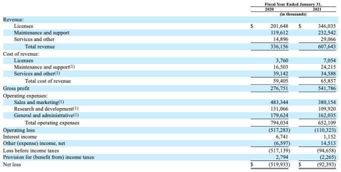 از بالا به پایین ، مشخص است که UiPath به سرعت در حال رشد است. می توانیم ببینیم که سود ناخالص آن در دوره 12 ماهه اخیر سریعتر از درآمد کلی رشد کرده است. همانطور که می توانید تصور کنید ، این ترکیب منجر به افزایش حاشیه ناخالص شرکت شد ، از 82٪ در سال مالی منتهی به 31 ژانویه 2020 ، به 89٪ در سال مالی بعدی.