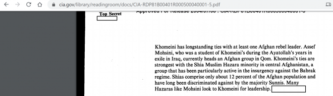 یک فعال هزاره می گوید ، "برای دهه ها ، در حالی که گروه های تروریستی پشتون مانند طالبان هزاره را قتل عام می کردند ، و دولتهای پشتون حقوق هزاره را تبعیض می کردند ، سیاستمداران و کارگزاران پشتون نیز چنین اتهامات دروغینی را به منظور غیرممکن ساختن هرگونه ارتباط محترمانه هزاره با جامعه جهانی. " این فعال یک سند کاملاً محرمانه محرمانه سیا به عنوان نمونه ای از این اتهامات دروغین عنوان کرده است. در آن سند ، آصف محسنی ، یکی از فرماندهان جنگ مشهور پشتون ، به عنوان هزاره و پیرو خمینی معرفی شده است.